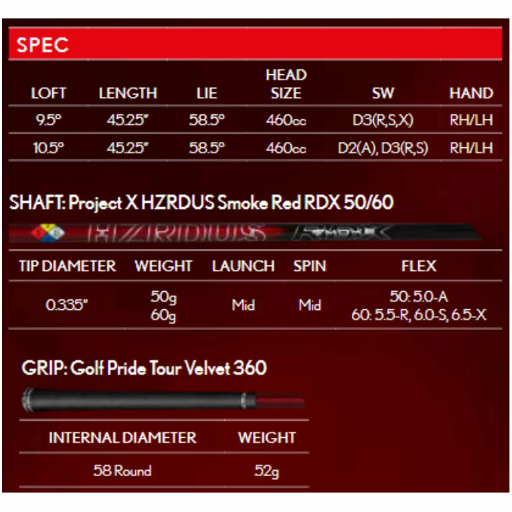 This drives as standard comes with a Hzrdus Red RDX Graphite Shaft and a Golf Pride Tour Velvet 360 grip.